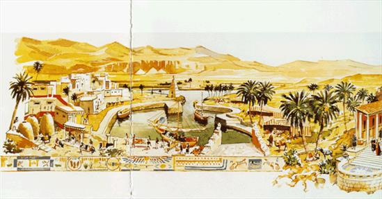 - una parte central, que simboliza el poderío mercantil de Egipto en aquel momento, los Americanos actuales casi, aunque los Romanos cortaban más en aquel preciso momento, probablemente. Está centrada esta parte en el supuesto puerto de Alejandría.